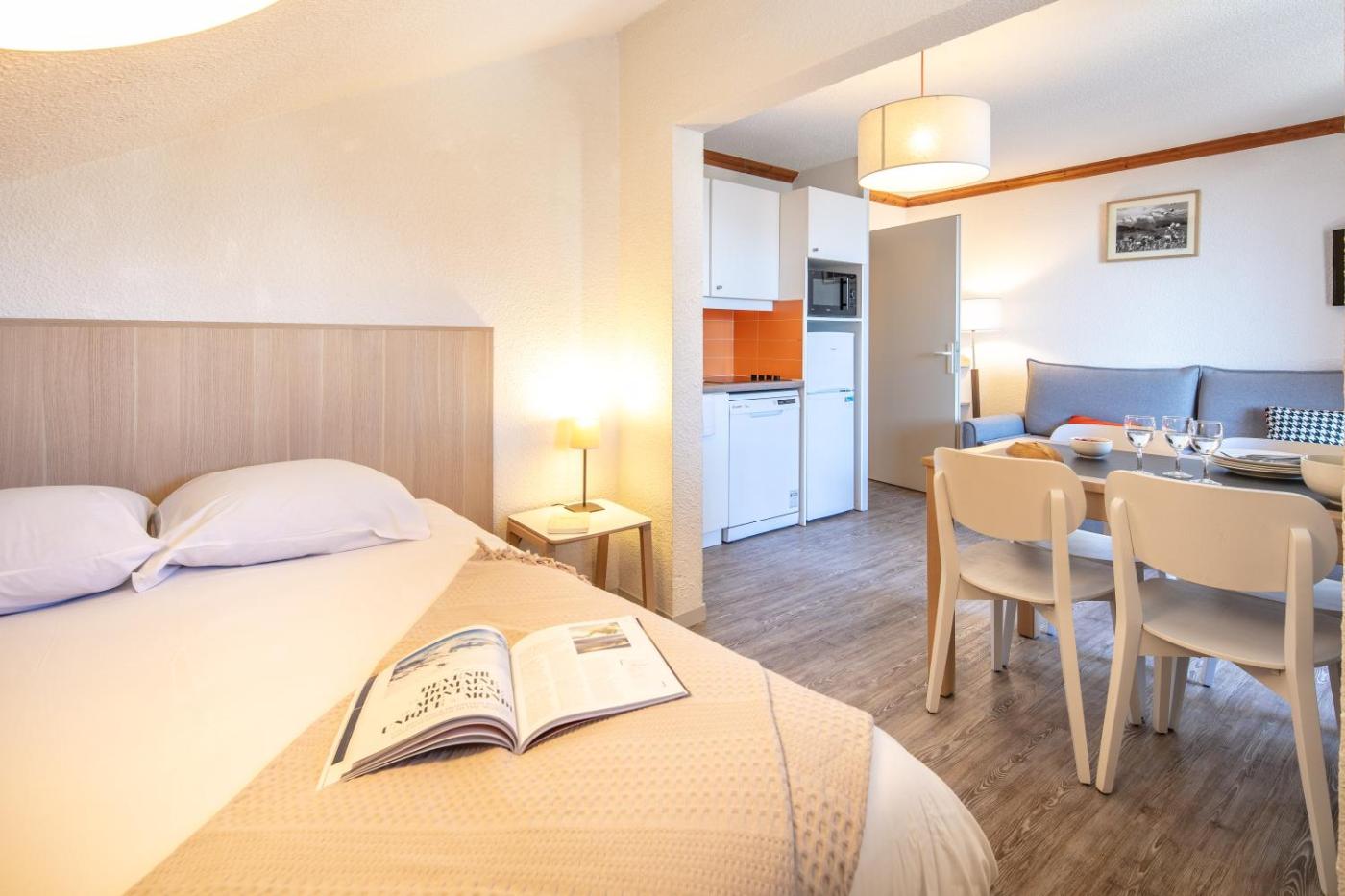Appartement 1 Chambre avec Couchage en Alcôve (6 Personnes) - Côté Sud. Cet appartement est doté dune pièce à vivre avec canapé-lit simple et 1 lit gigogne (recommandé pour les enfants) ainsi que dune alcôve avec 2 lits superposés. Vous disposerez d’une chambre avec un lit double. La salle de bains indépendante est pourvue d’une baignoire. La kitchenette entièrement équipée s’ouvre sur la pièce à vivre. Veuillez noter que vous devrez nettoyer le coin cuisine avant votre départ. Certains appartements ont été rénovés. Veuillez contacter la réception pour de plus amples informations. ;